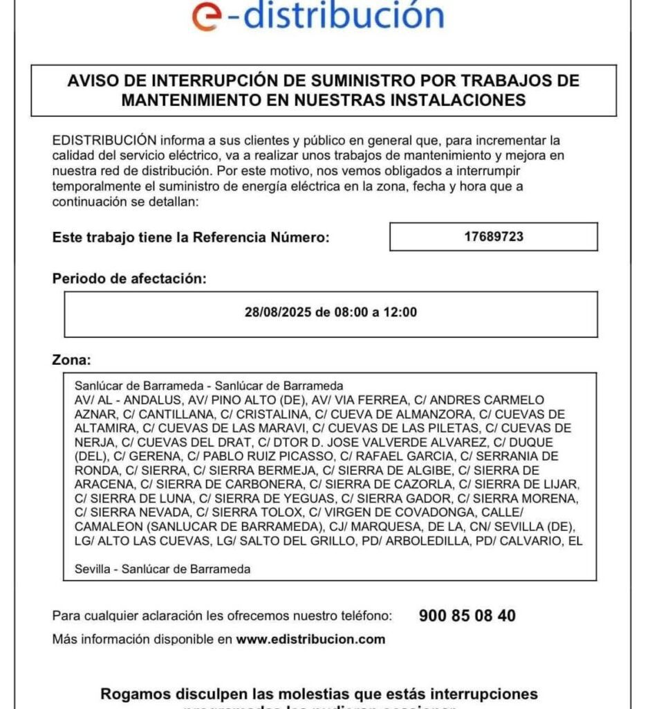 La empresa e-Distribución ha anunciado una interrupción temporal del suministro eléctrico en Sanlúcar de Barrameda debido a trabajos de mantenimiento y mejora en la red de distribución. Esta actuación, comunicada también por el Ayuntamiento, afectará a un amplio número de calles del municipio durante la mañana del jueves 28 de agosto de 2025, en horario de 08:00 a 12:00 horas.