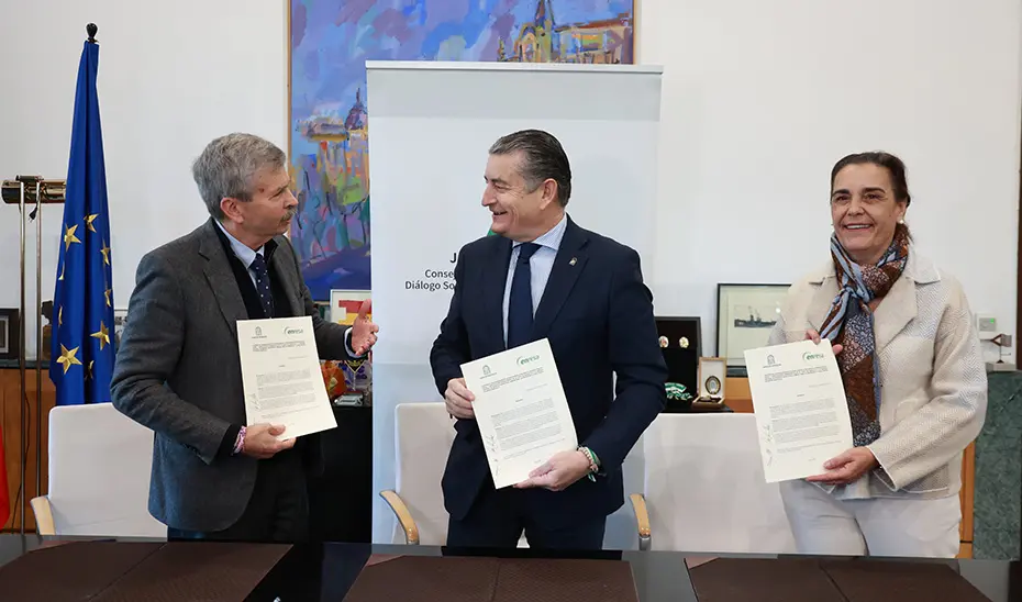 El consejero de la Presidencia, Interior, Diálogo Social y Simplificación Administrativa, Antonio Sanz, y el presidente Enresa, José Luis Navarro, han suscrito en el Palacio de San Telmo un acuerdo de colaboración entre ambas instituciones para impulsar medidas de prevención y lucha contra los incendios forestales en Andalucía. Al acto ha asistido también la directora del centro de almacenamiento de El Cabril, Eva Noguero.
