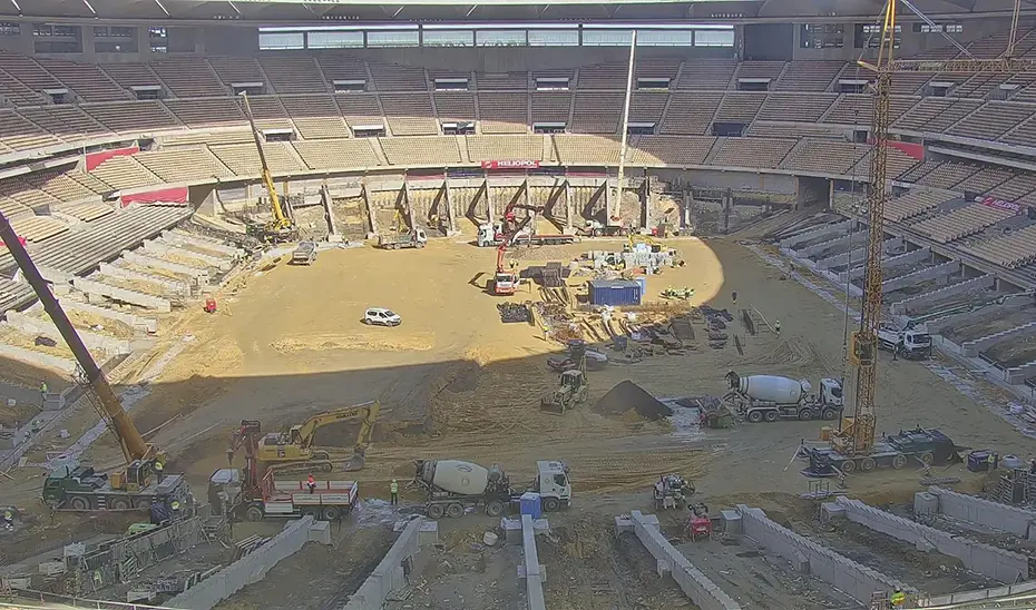 Actualmente, ya han concluido los trabajos de cimentación y, en pocos días, también se habrán terminado los trabajos sobre la estructura -que están a más del 90% de ejecución-, lo que supone un adelanto de diez días respecto al cronograma. Asimismo, se están colocando las primeras gradas originales, que fueron desmontadas previamente y, una vez realizada esta tarea, se procederá a la colocación paulatina del resto de graderío.
