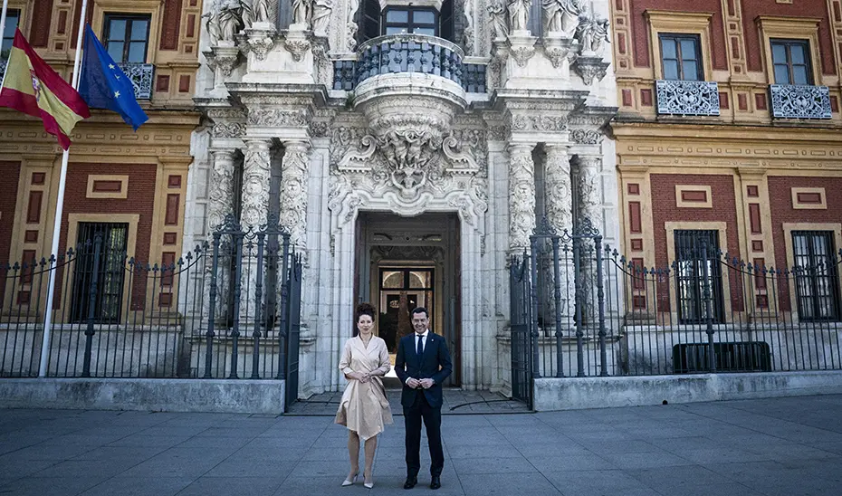 El presidente de la Junta, Juanma Moreno, y la presidenta del Comité Europeo de las Regiones, Kata Tutto, posan ante la fachada principal del Palacio de San Telmo, en Sevilla.