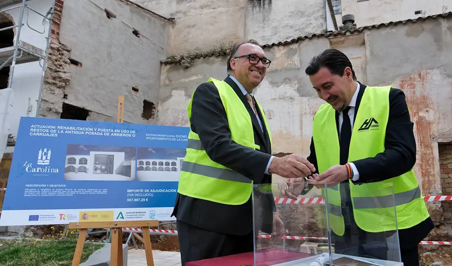 El consejero de Turismo y Andalucía Exterior de la Junta de Andalucía, Arturo Bernal, ha participado en el acto de colocación de la primera piedra con el que se han iniciado las obras de rehabilitación de la Antigua Posada de La Carolina (Jaén), con una inversión de 368.000 millones de euros recogidos en el Plan de Sostenibilidad Turística en Destino (PSTD).