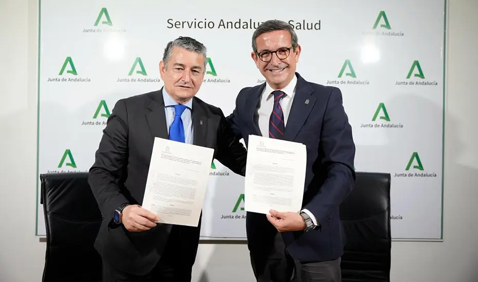 El consejero de Sanidad, Presidencia y Emergencias, Antonio Sanz, y el consejero de Industria, Energía y Minas y presidente de la Agencia Digital de Andalucía (ADA), Jorge Paradela, han suscrito un protocolo de colaboración entre la ADA y el Servicio Andaluz de Salud (SAS) para «impulsar nuevos proyectos de innovación digital que mejorarán la relación entre la ciudadanía y su sistema sanitario».
