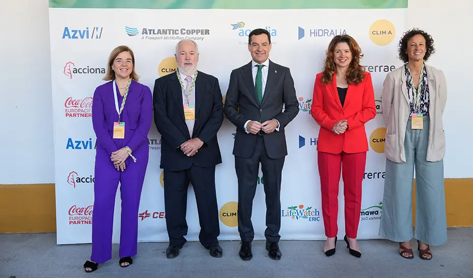 El presidente de la Junta, Juanma Moreno, junto a la consejera de Sostenibilidad, Catalina García y otras autoridades presentes en este encuentro internacional.