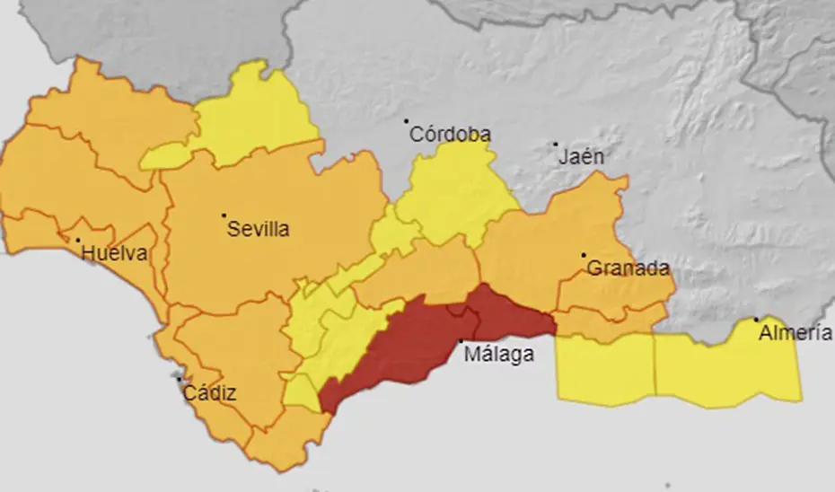 Tienen vigente también el nivel naranja por precipitaciones las provincias de Granada (Cuenca del Genil, Nevada y Alpujarras y Costa) hasta las 8.00 horas, Cádiz (Litoral, Estrecho y Campiña) hasta las 18.00 horas, Huelva (Aracena, Litoral, Andévalo y Condado) durante toda la jornada y Sevilla (Campiña) hasta las 18.00 horas.