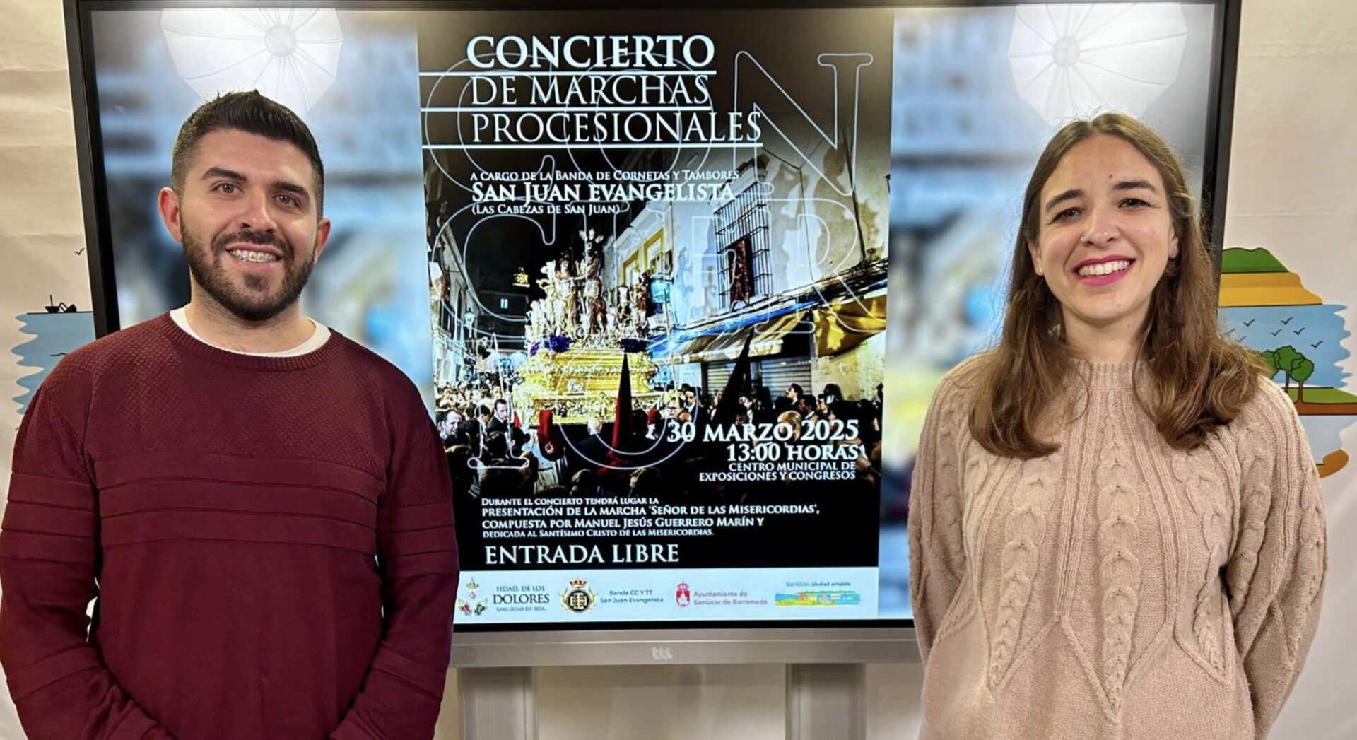 El delegado de Cultura y Fiestas, Narciso Vital, ha presentado hoy el cartel anunciador de este evento junto a la secretaria de la Hermandad de los Dolores, Rocío Gálvez, quien en su intervención ha agradecido al Ayuntamiento su apoyo y ha informado que el programa del concierto incluye la presentación de Señor de las Misericordias, marcha compuesta por Manuel Jesús Guerrero Marín que está dedicada al titular de la popular cofradía del Miércoles Santo sanluqueño.
