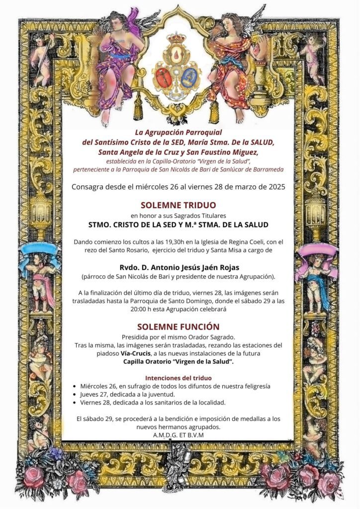 La Agrupación Parroquial del Santísimo Cristo de la Sed, María Santísima de la Salud, Santa Ángela de la Cruz y San Faustino Míguez, con sede en la Capilla-Oratorio “Virgen de la Salud” y perteneciente a la Parroquia de San Nicolás de Bari, celebrará del miércoles 26 al viernes 28 de marzo de 2025 un solemne triduo en honor a sus Sagrados Titulares.