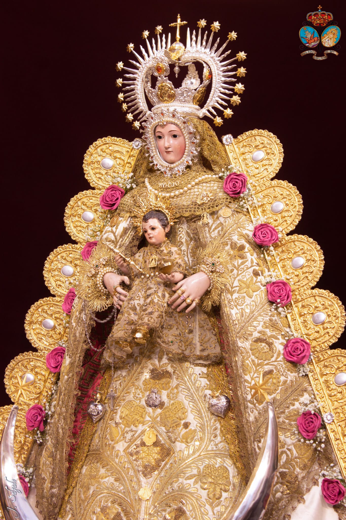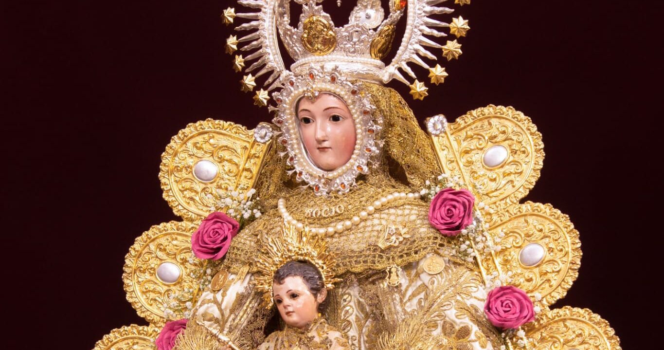 La devota imagen de la Virgen luce una saya de torero bordada en oro, una prenda con gran valor histórico y emocional, donada hace varias décadas por el «Marismeño». Por su parte, el Divino Pastorcito viste una de sus túnicas bordadas en oro sobre tul, añadiendo un toque de majestuosidad a su figura.