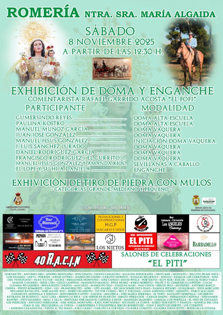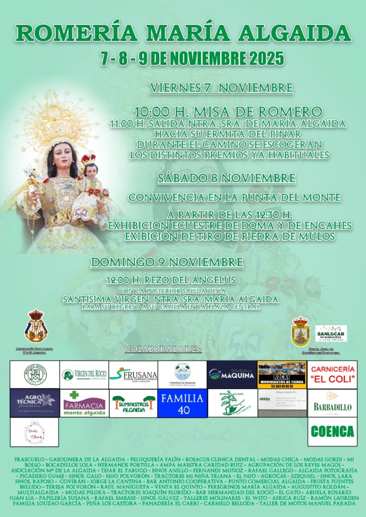 La tradicional Romería de Nuestra Señora de María Algaida se celebrará en Sanlúcar de Barrameda del 7 al 9 de noviembre de 2025, organizada por la Asociación Romera María Algaida. Serán tres días de devoción, convivencia y tradición en el entorno natural del Pinar de la Algaida, donde vecinos y romeros disfrutarán de un completo programa de actos.