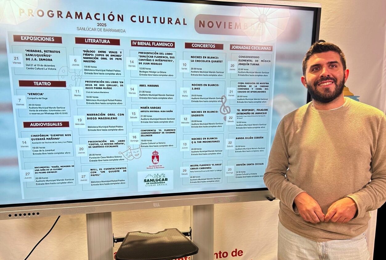 En el apartado musical, destacan una nueva edición de las Jornadas Cecilianas y del ciclo Noches en Blanco, así como las actividades anunciadas en Sanlúcar dentro de la IV Bienal de Flamenco de Cádiz, Jerez y los Puertos. Igualmente, la programación incluye, por ejemplo, eventos literarios, proyecciones audiovisuales y teatro. Un mes más, la mayor parte de las citas culturales se llevarán a cabo en instalaciones municipales, como el Auditorio ‘Manolo Sanlúcar’, el Centro Cultural La Victoria, la Biblioteca Pública ‘Rafael Pablos’ y la Casa de la Juventud.