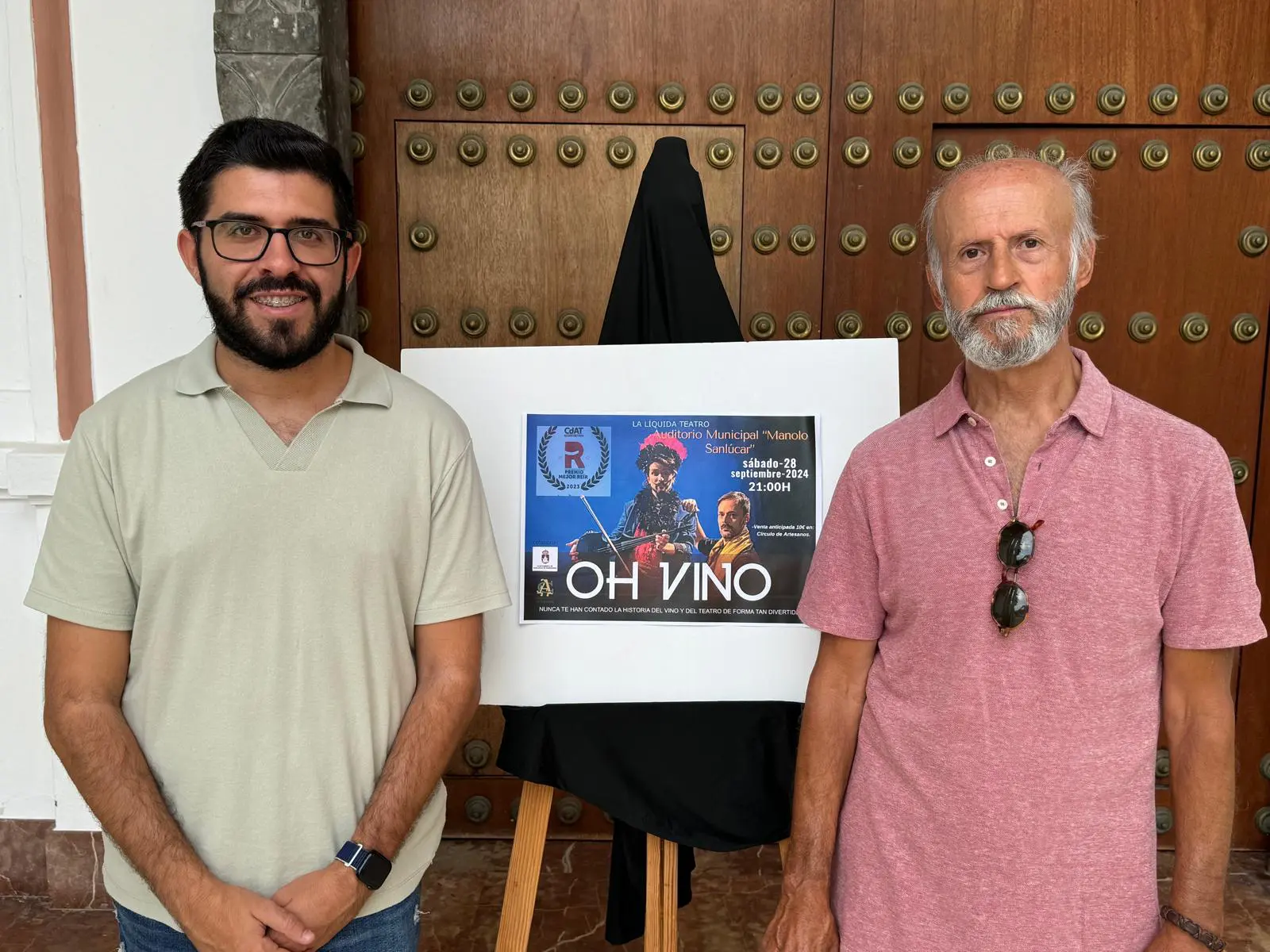 El delegado municipal de Cultura, Narciso Vital, ha presentado un nuevo evento de la programación cultural de septiembre en Sanlúcar. Acompañado por Francisco Pérez del Yelmo, en representación del Círculo de Artesanos, ha anunciado que la compañía de teatro La Líquida escenificará el espectáculo Oh Vino el próximo sábado 28 de septiembre, a las 21:00 horas, en el Auditorio Municipal ‘Manolo Sanlúcar’