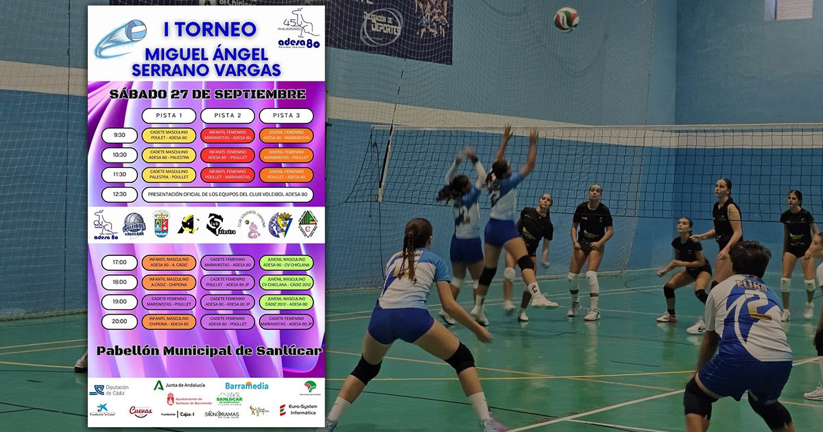 Este sábado 27 de septiembre, el Pabellón Municipal de Sanlúcar de Barrameda será escenario del I Torneo Miguel Ángel Serrano Vargas, una jornada completa dedicada al voleibol en la que se darán cita algunos de los clubes más representativos de Andalucía. El evento, organizado por el Club Voleibol Adesa 80 con motivo de su 45º aniversario, dará comienzo a las 9:30 horas y se prolongará hasta bien entrada la noche.