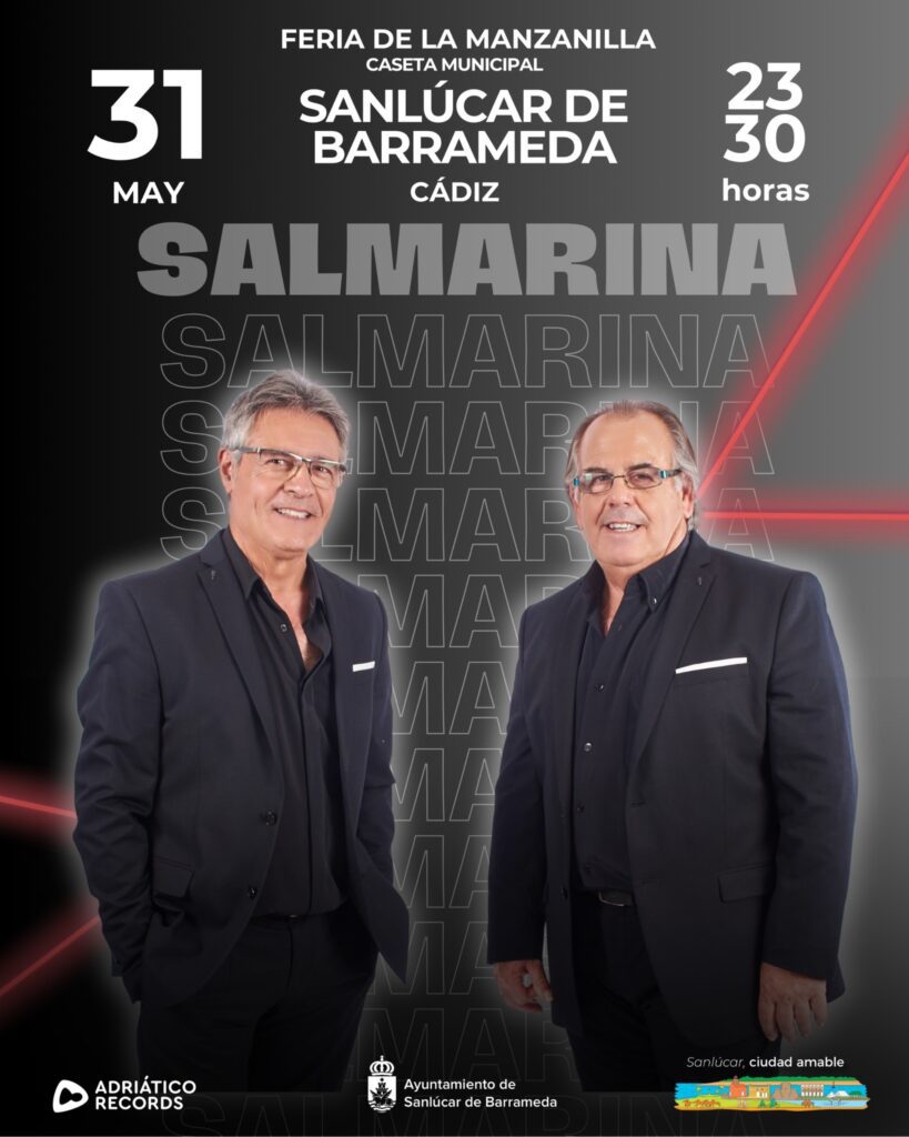 La Caseta Municipal de la Feria de la Manzanilla 2025 será escenario este sábado, 31 de mayo, de la actuación del grupo Salmarina, uno de los máximos exponentes del género de las sevillanas. Será a las 23:30h. El grupo sanluqueño, formado en la actualidad por José Antonio Conde y José Antonio Martínez, volverá a actuar en su localidad natal dentro del programa elaborado por el Ayuntamiento para esta edición de la Feria.