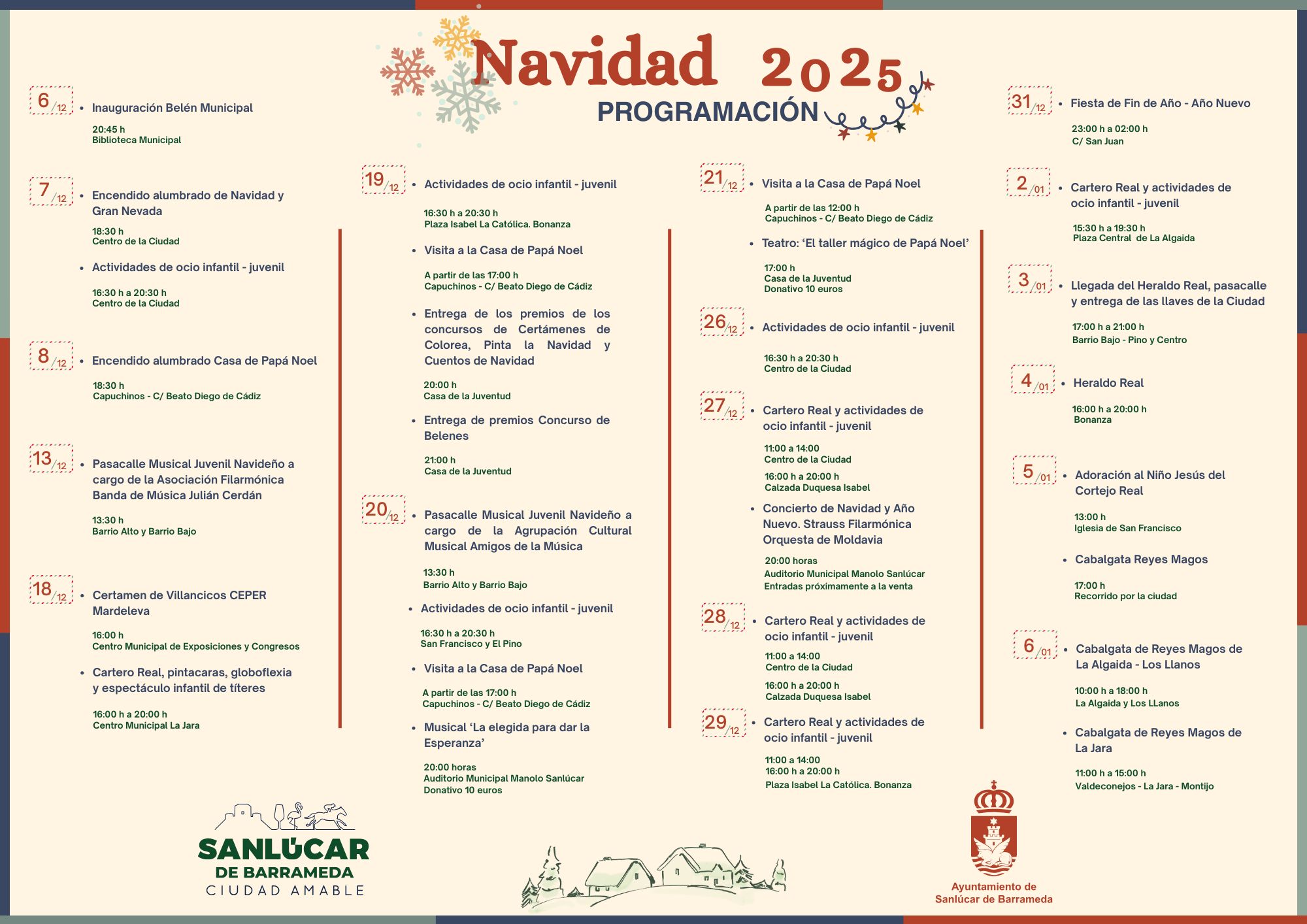 El Ayuntamiento de Sanlúcar de Barrameda ha presentado su programación oficial de Navidad 2025, con una treintena de actividades que incluyen eventos para todas las edades y que se desarrollarán en distintos barrios y espacios públicos de la ciudad.