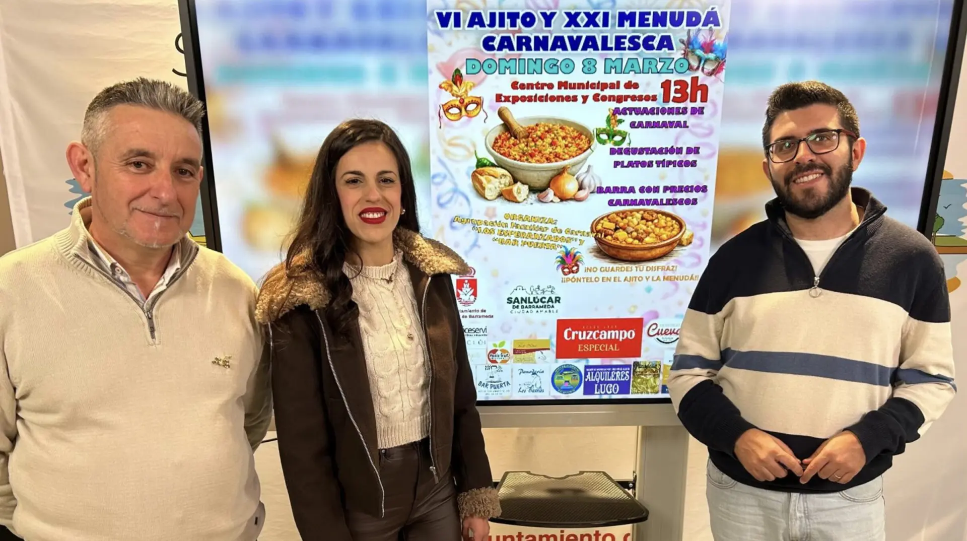 El delegado de Fiestas, Narciso Vital, ha presentado hoy el cartel anunciador junto a Juan Carlos Bernal, presidente de dicha agrupación, y Virtu Puerta, que ha intervenido en nombre de Bar Puerta. Todos ellos han coincidido en destacar la iniciativa de “fusionar” ambos eventos que se han venido celebrando hasta ahora por separado a fin de convertirlo en un acontecimiento de mayor relevancia dentro del Carnaval de Sanlúcar. Incluirá actuaciones de agrupaciones carnavalescas y la degustación de platos típicos. Además, habrá una barra con precios populares.