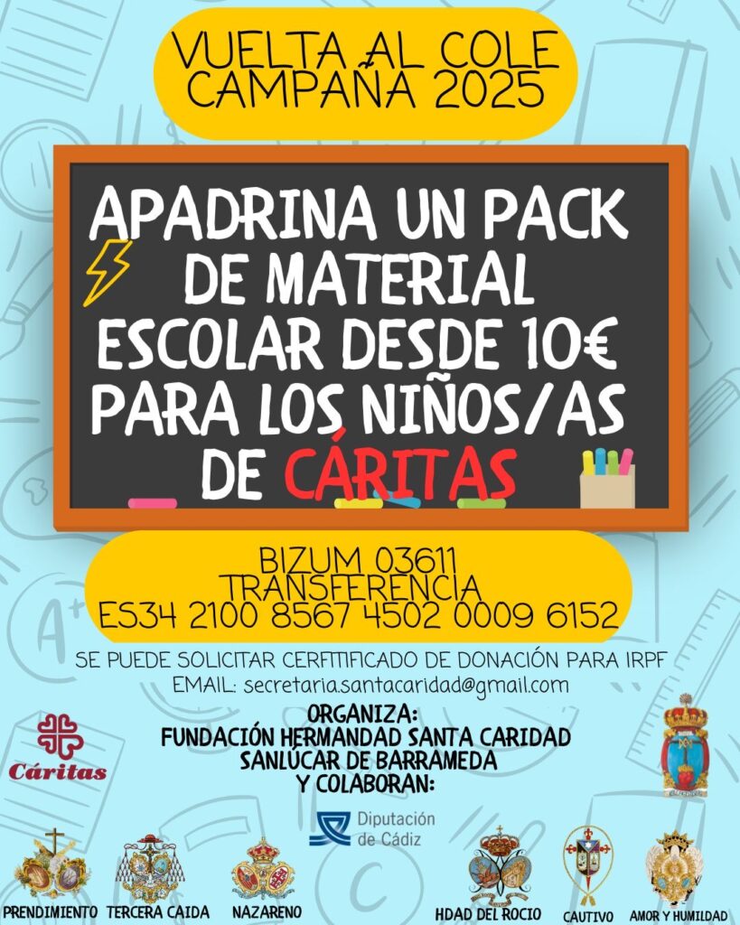 La Fundación Hermandad de la Santa Caridad y Pobres Desamparados de Sanlúcar de Barrameda ha puesto en marcha la campaña “Vuelta al Cole 2025”, cuyo objetivo es recaudar fondos para proporcionar packs de material escolar a menores en situación de dificultad económica. Con un donativo a partir de 10 euros, cualquier persona puede apadrinar un lote que irá destinado a niños y niñas atendidos por Cáritas.