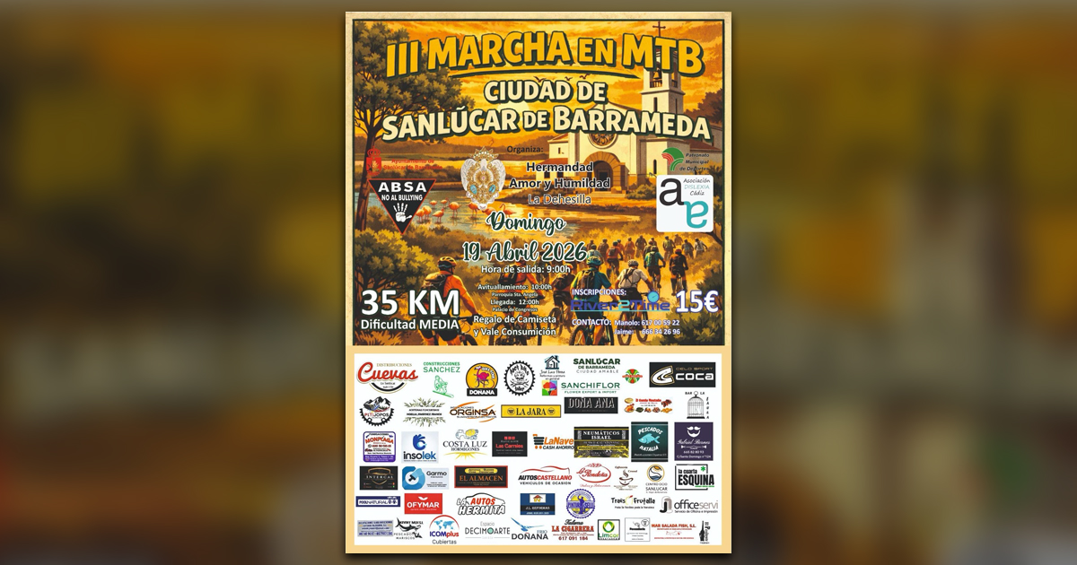 La Hermandad de Santa Ángela ha organizado la III Marcha Cicloturista solidaria, que se celebrará el próximo domingo 19 de abril en Sanlúcar de Barrameda con un recorrido de 35 kilómetros y un marcado carácter solidario en apoyo a la asociación ABSA No al Bullying y a la Asociación provincial de Dislexia Cádiz.